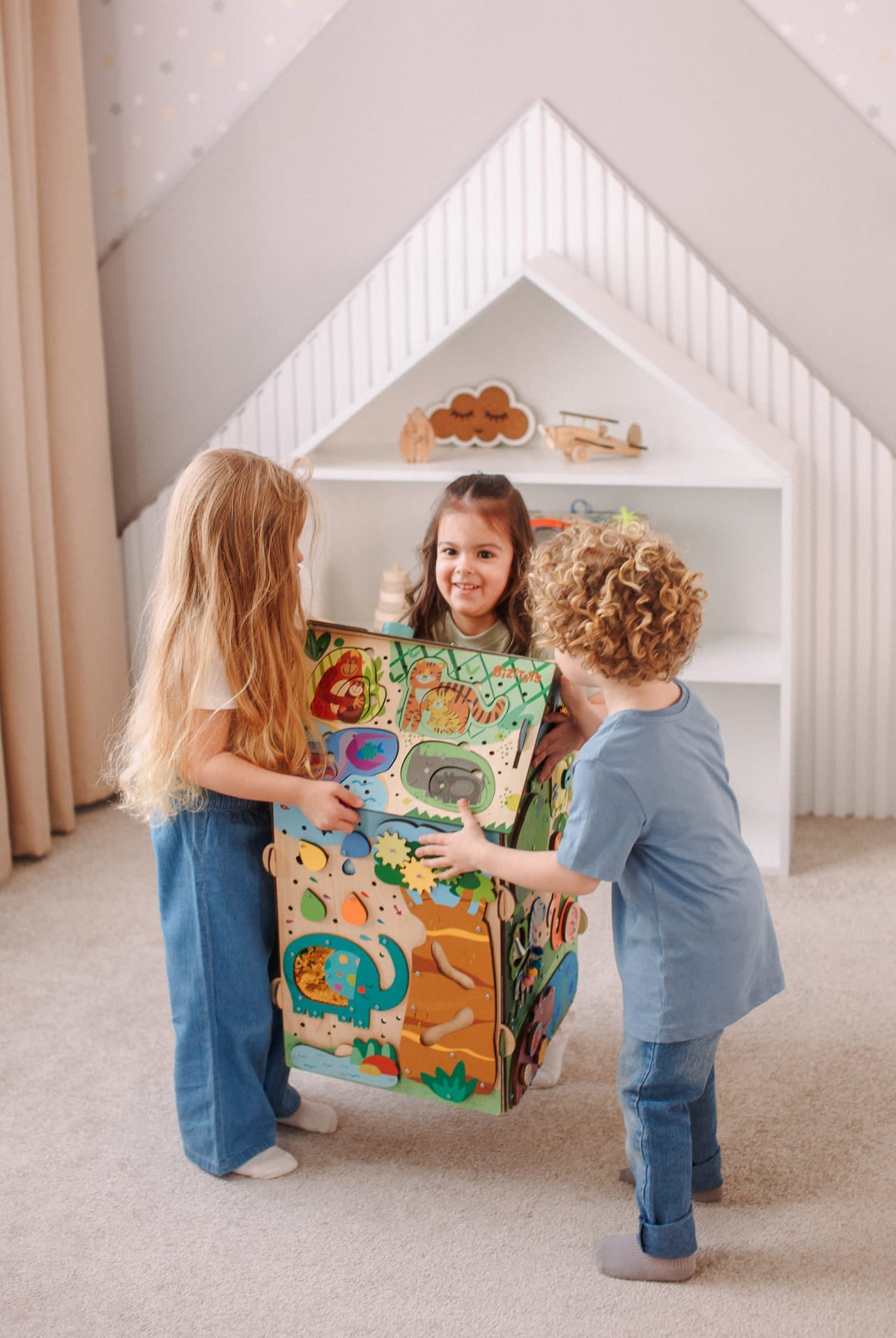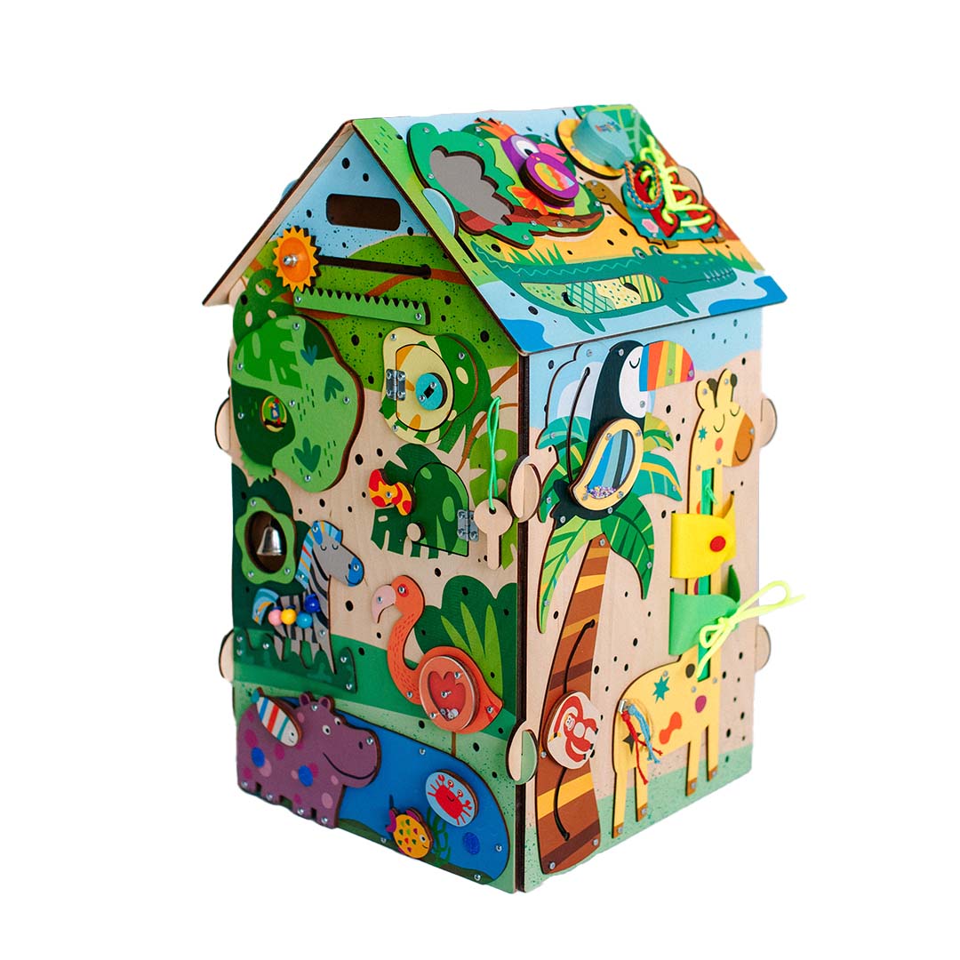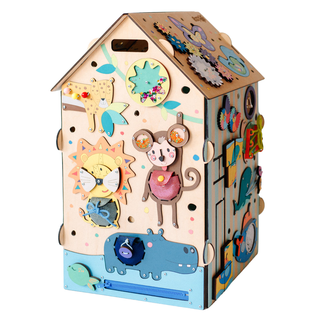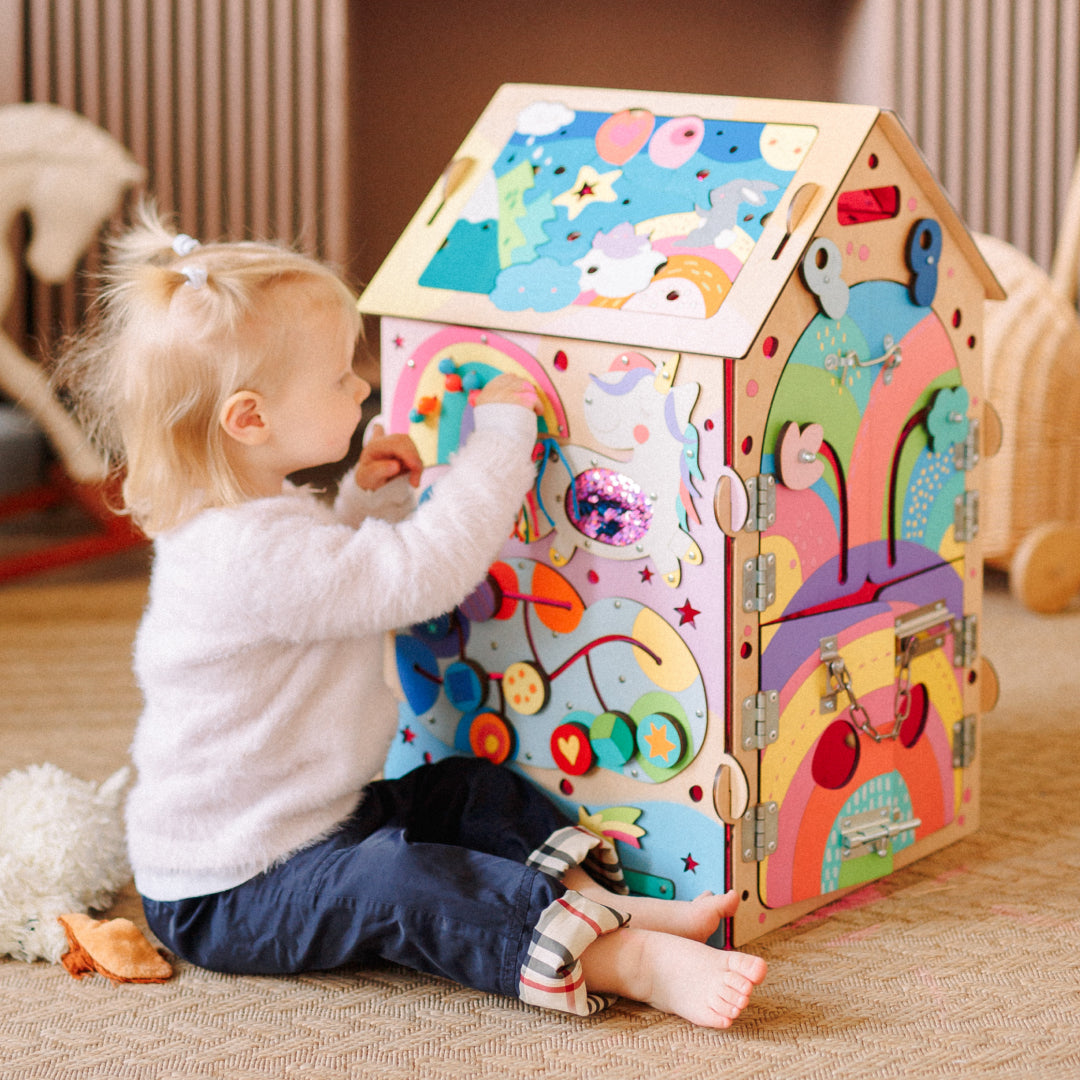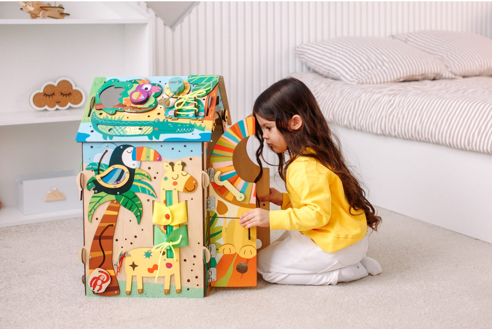 Switch 💡: Illuminate the Busy House with a simple twist. All batteries are securely hidden for safety.