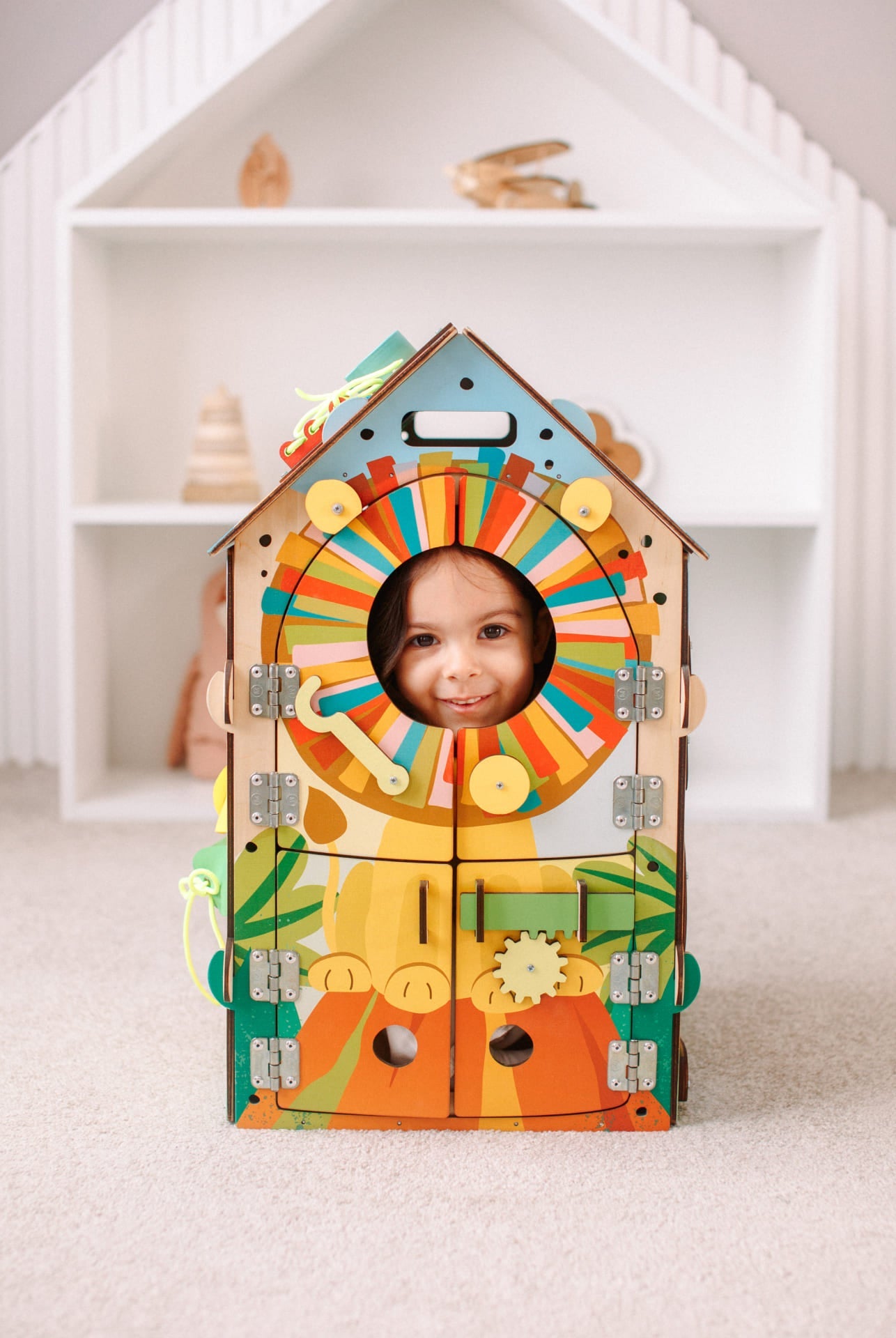 Doors 🚪: Open the doors, and kids can crawl inside to become a little lion cub, safely playing in a sanded archway with wooden latches.